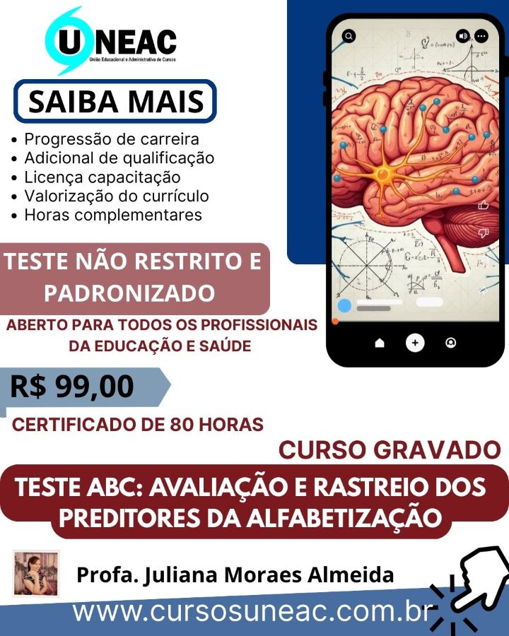 O curso Teste ABC capacita profissionais da educação e saúde para aplicar, corrigir e interpretar o Teste ABC, um instrumento não restrito e padronizado para avaliação e rastreio dos preditores da alfabetização.